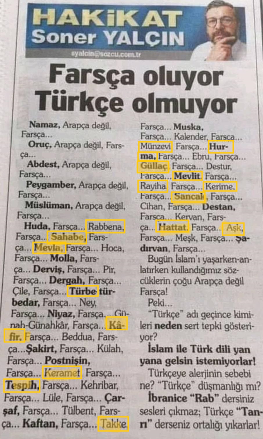 Namaz, Arapça değil, Farsça… Oruç, Arapça değil, Farsça… Abdest, Arapça değil, Farsça… Peygamber, Arapça değil, Farsça… Müslüman, Arapça değil, Farsça… Huda, Farsça… Rabbena, Farsça… Sahabe, Farsça… Mevla, Farsça… Hoca, Farsça… Molla, Farsça… Derviş, Farsça… Pir, Farsça… Dergah, Farsça… Çile, Farsça… Türbe-türbedar, Farsça… Ney, Farsça… Niyaz, Farsça… Günah-Günahkâr, Farsça… Kâfir, Farsça… Beddua, Farsça…Şakirt, Farsça… Külah, Farsça… Postnişin, Farsça… Keramet, Farsça… Tespih, Farsça… Kehribar, Farsça… Lüle, Farsça… Çarşaf, Farsça… Tülbent, Farsça… Kaftan, Farsça… Takke, Farsça… Muska, Farsça… Kalender, Farsça… Münzevi, Farsça… Hurma, Farsça… Ebru, Farsça… Güllaç, Farsça… Destur, Farsça… Mevlit, Farsça… Rayiha, Farsça… Kerime, Farsça… Sancak, Farsça… Cihan, Farsça… Destan, Farsça… Kervan, Farsça… Hattat, Farsça… Aşk, Farsça… Meşk, Farsça… Şadırvan, Farsça… Bugün İslam'ı yaşarken-anlatırken kullandığımız sözcüklerin çoğu Arapça değil Farsça! Peki… “Türkçe” adı geçince kimileri neden sert tepki gösteriyor? İslam ile Türk dili yan yana gelsin istemiyorlar! Türkçeye alerjinin sebebi ne? “Türkçe” düşmanlığı mı? İbranice “Rab” dersiniz sesleri çıkmaz; Türkçe “Tanrı” derseniz ortalığı yıkarlar!