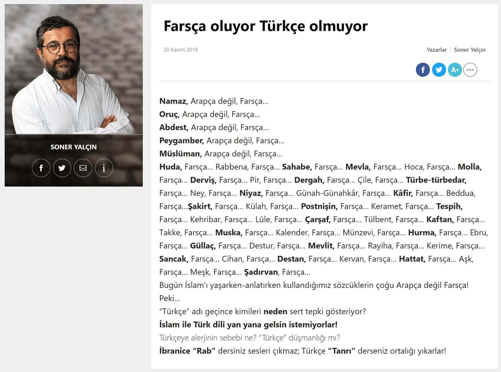 Soner Yalçın’ın 20 Kasım 2018 tarihinde Sözcü Gazetesinde yayınlanan “Farsça oluyor Türkçe olmuyor” başlıklı yazısı ciddi hatalar içiyor.