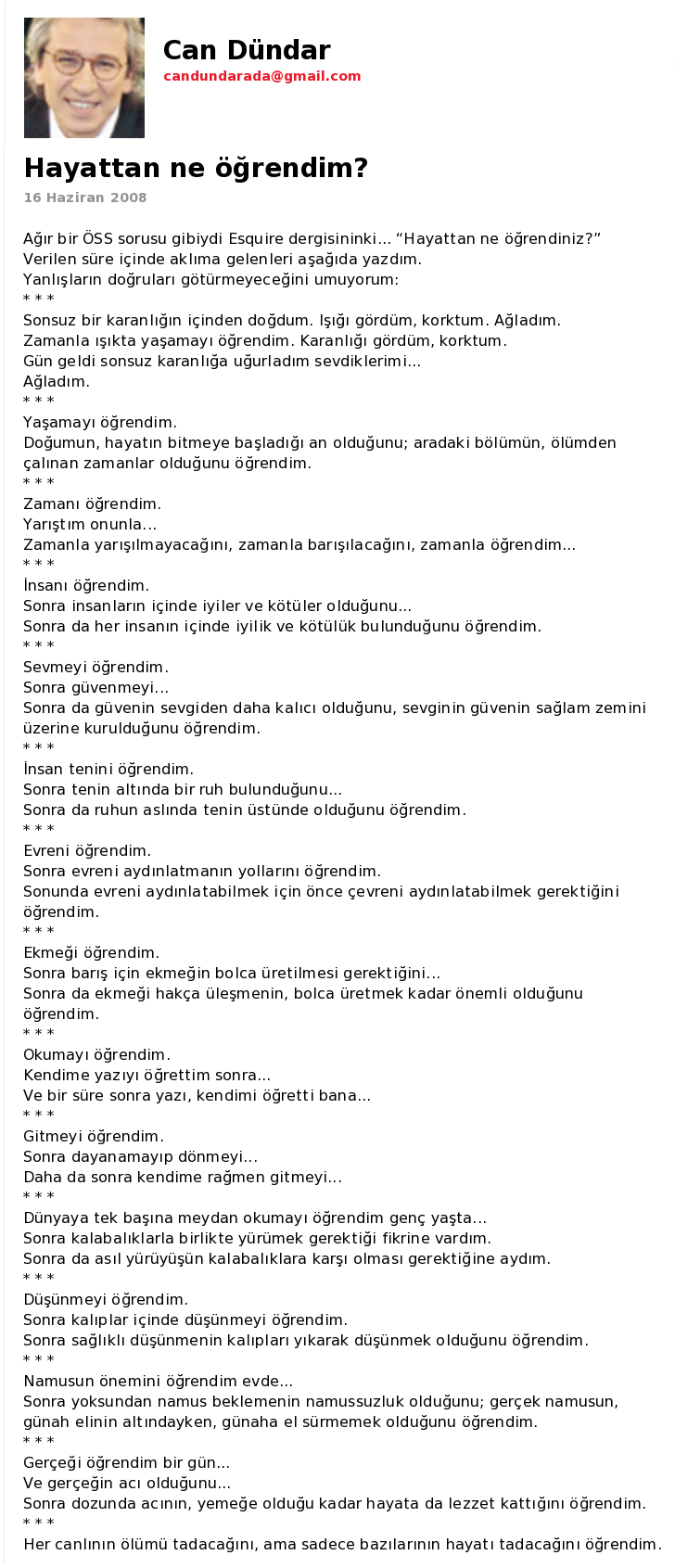 Bu satırların kaynağı Mevlânâ değil, Can Dündar’dır. Anılı metin, Can Dündar’ın Milliyet Gazetesi’nde 16 Haziran 2008 tarihinde yayınlanan “Hayattan ne öğrendim” başlıklı yazısının birebir aynısından başka bir şey değil.