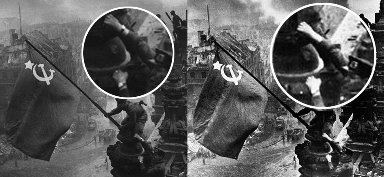 İkinci Dünya Savaşı’nın sembolik karelerinden biri olan Yevgeny Khaldei tarafından 1945 Mayıs’ında çekilen Sovyet askerlerinin Reichstag’a SSCB bayrağı diktikleri fotoğrafta Rus ordusunun yağma yaptığını gizlemek için askerin saatleri sonradan silinmişti.