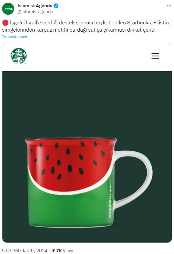 Islamist Agenda (@islamistagenda): ” İşgalci İsrail’e verdiği destek sonrası boykot edilen Starbucks, Filistin simgelerinden karpuz motifli bardağı satışa çıkarması dikkat çekti.”