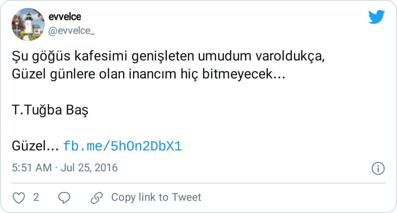 “Şu göğüs kafesimi genişleten umudum varoldukça,Güzel günlere olan inancım hiç bitmeyecek. T.Tuğba Baş(16/06/2016) Bizzat şahsıma aittir ve ilk kez evvelce isimli sayfamda paylaşılmıştır.Bu bilgi kirliliğinin bir an önce düzeltilmesi dileğiyle”