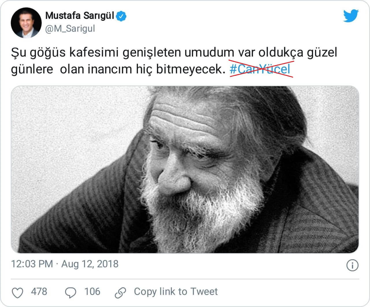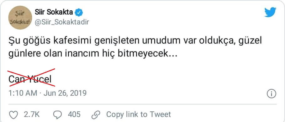 Ancak sanılanın aksine bahsi geçen vecize Can Yücel’e değil, T. Tuğba Baş’a ait.