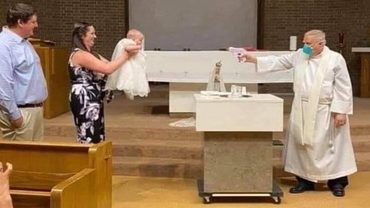 ABD’de bir bebeğin sosyal mesafe tedbirlerine uyan maskeli bir rahip tarafından uzaktan su tabancasıyla vaftiz edildiği sanılan fotoğraf şöyle: