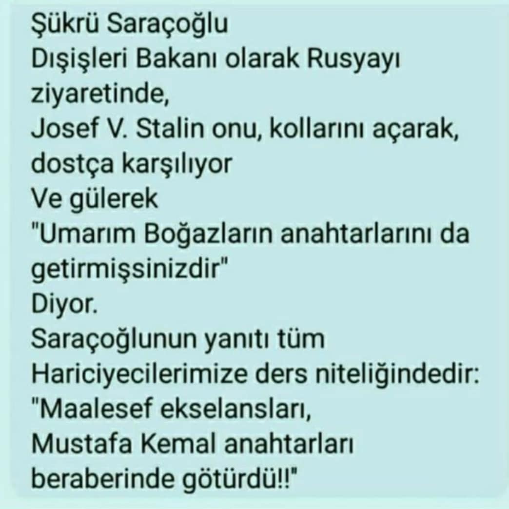 "SSCB’nin en sert uygulamaları ile kendinden söz ettiren lideri Stalin 1939'un sonunda Moskova'da Türk Dışişleri Bakanı Şükrü Saraçoğlu'nu kabul ettiğinde onu "Umarım Boğazların anahtarlarını getirmişsinizdir," sözleriyle karşılamıştı. Tecrübeli siyasetçi ise o tarihin en sert diktatörüne "Özür dilerim ekselansları. Mustafa Kemal yanına aldı." yanıtı vererek, Türkiye’nin Boğazlar konusundaki ilelebet tavrını net bir dille ortaya koymuştu."