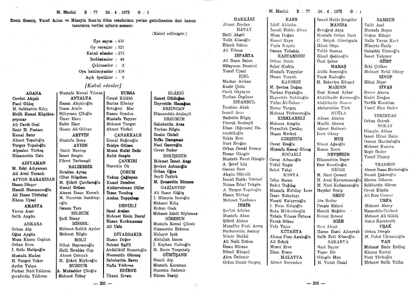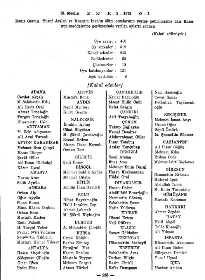 Söz konusu idam kararının kabulüne dair kanun teklifi TBMM’de 10 Mart 1972 günü gerçekleşen 58. Birleşim’de (3. Dönem, 23. Cilt, 3. Toplantı) ele alındı. Anılan 3 kişinin idamına ilişkin kanun tasarısı, yapılan oylamada kabul edildi. 8 açık üyeliğin bulunduğu toplam 450 vekillik Meclis’te 318 vekil oylamaya katıldığı oturumda, 245 vekil kabul yönünde oy verirken, 63 vekil red yönünde oy verdi, 10 vekil ise çekimser kaldı. 124 vekil oylamaya katılmadı. “Deniz Gezmiş, Yusuf Arslan ve Hüseyin İnan’ın ölüm Cezalarının Yerine Getirilmesine Dair Kanun” 25 Mart 1972 tarihli Resmî Gazete’de yayımlandı. CHP tarafından, 10 Mart 1972 günü kabul edilen kanun tasarısının iptali için Anayasa Mahkemesi’ne başvuru yapıldı. Anayasa Mahkemesi, Deniz Gezmiş ve arkadaşlarının idam kararını onaylayan kanunun -CHP’nin talebi üzerine- usûl ve şekil yönünden iptaline 6 Nisan 1972 günü karar verdi. Anayasa Mahkemesi’nin verdiği bu kararın ardından adı geçen 3 kişinin idamına ilişkin yeni kanun tasarısı 24 Nisan 1972’de tekrar Meclis’te görüşüldü. Meclis’te gerçekleşen 77. Birleşim’de (3. Dönem, 24. Cilt ve 3. Toplantı) , Anayasayı zorla değiştirmeye veya ortadan kaldırmaya ve TBMM’yi zorla devirmeye teşebbüs suçlarından ölüm cezası hükümlü olan anılan 3 kişinin ölüm cezasına çarptırılmaları hakkında Başbakanlık tezkeresi ve Adalet Komisyonu raporu ele alındı. Akabinde TBMM Genel Kurulu’nda Deniz Gezmiş, Yusuf Aslan ve Hüseyin İnan’ın ölüm cezalarının yerine getirilmesine dair kanun tasarısı oylandı. Yapılan oylamanın sonucunda, idam cezasının infazını öngören kanun kabul edildi. Yeniden kabul edilen “Deniz Gezmiş, Yusuf Arslan ve Hüseyin İnan’ın Ölüm Cezalarının Yerine Getirilmesine Dair Kanun” 5 Mayıs 1972 tarihli Resmî Gazete’de yayımlandı. O dönemde 25 yaşında olan Gezmiş ve Aslan ile 23 yaşındaki İnan, 6 Mayıs 1972 tarihinde sabaha karşı idam edildi. |