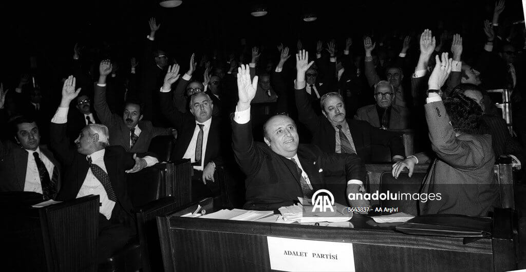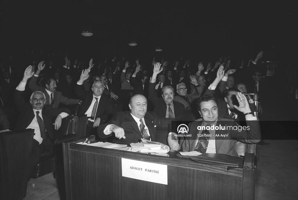 TBMM Genel Kurulu’nda Hükümet Programı görüşmeleri sonrası Adalet Partisi (AP) Genel Başkanı Demirel (sağ 2) ve AP milletvekilleri oylamaya katıldı. (Arşiv)