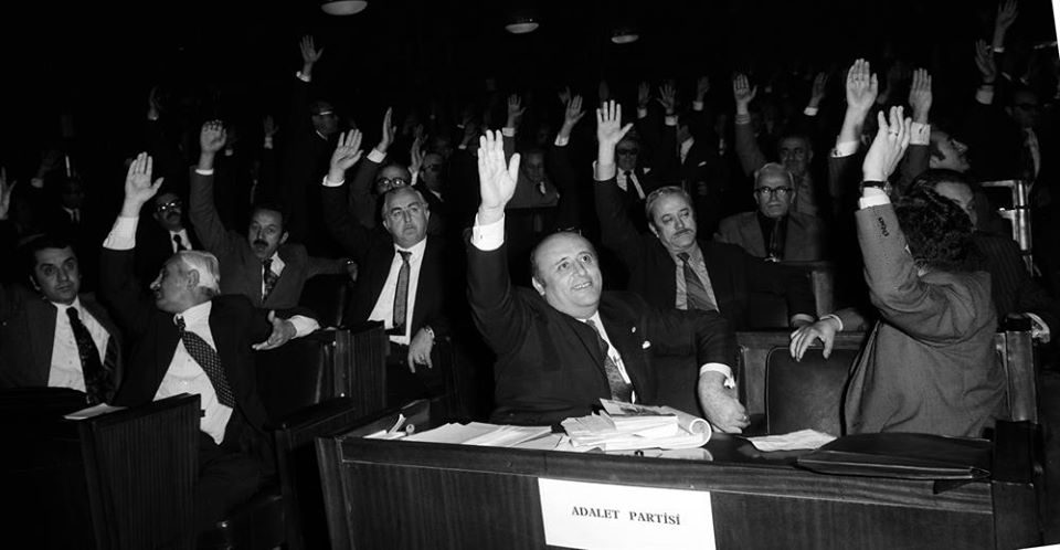 Süleyman Demirel ile Nahit Menteşe, Ahmet Buldanlı, Turgut Toker ve Sabri Keskin gibi Adalet Partisi’nden (AP) milletvekillerinin görüldüğü fotoğraf 5 Şubat 1974 günü TBMM Genel Kurulu’nda CHP-MSP koalisyon hükümetinin programı üzerindeki görüşmeler sonrası yapılan oylama sırasında kaydedilmiş.