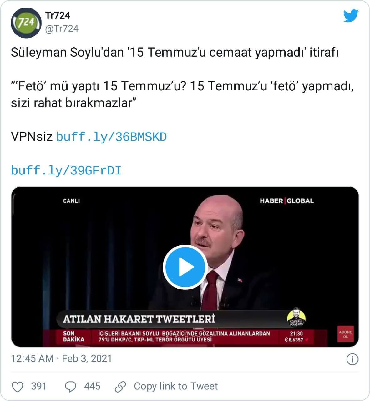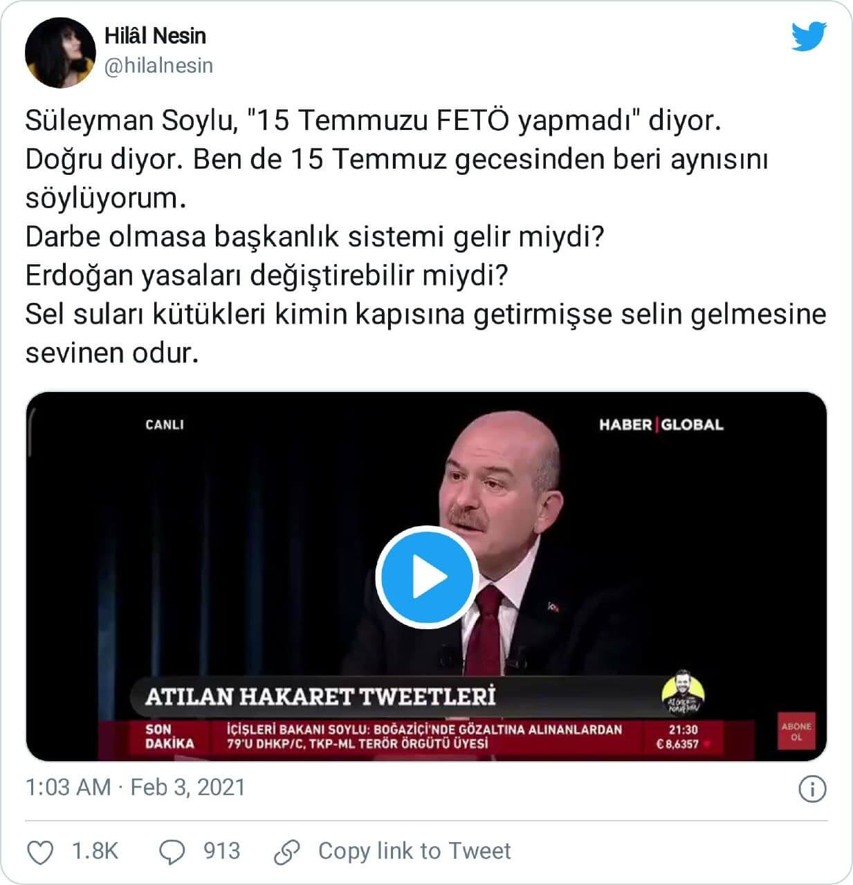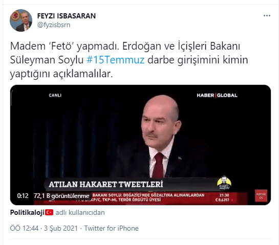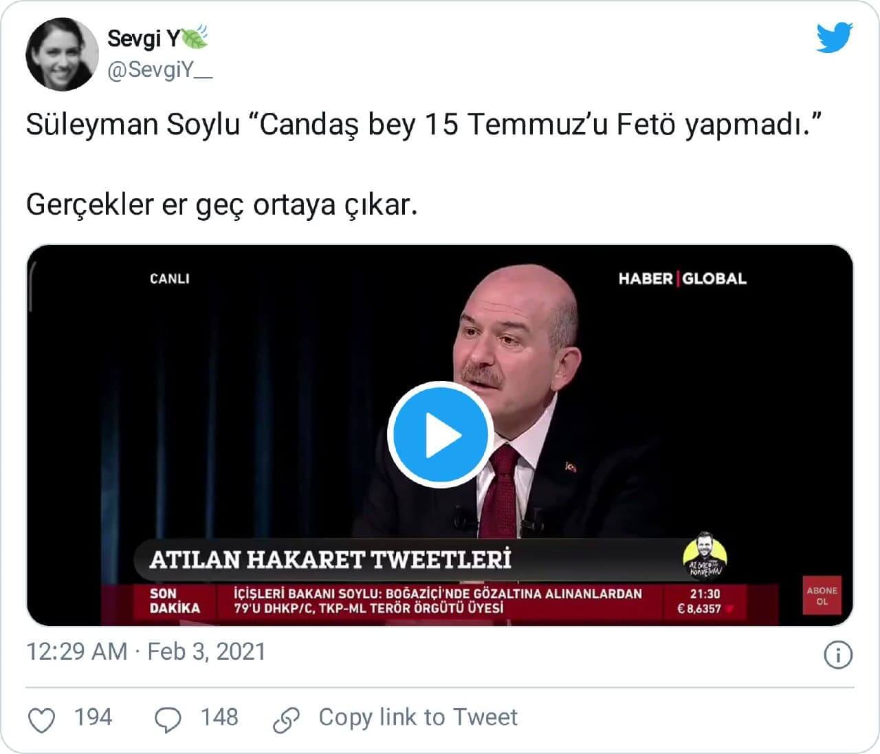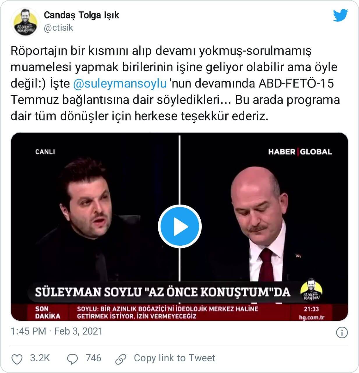 İçişleri Bakanı Süleyman Soylu’nun Haber Global’de 02 Şubat 2021 günü yayınlanan Az Önce Konuştum adlı programda Candaş Tolga Işık’ın sorularını yanıtlarken 15 Temmuz 2016 darbe girişimi ile ilgili kullandığı ifadeler bağlamından kopartılarak paylaşılmıştı.