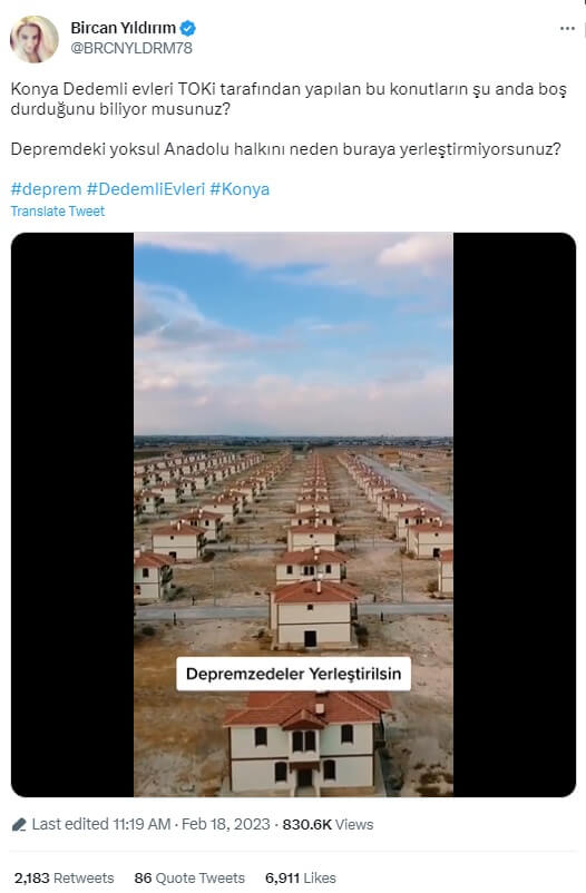 Bircan Yıldırım (@BRCNYLDRM78): Konya Dedemli evleri TOKi tarafından yapılan bu konutların şu anda boş durduğunu biliyor musunuz? Depremdeki yoksul Anadolu halkını neden buraya yerleştirmiyorsunuz?
