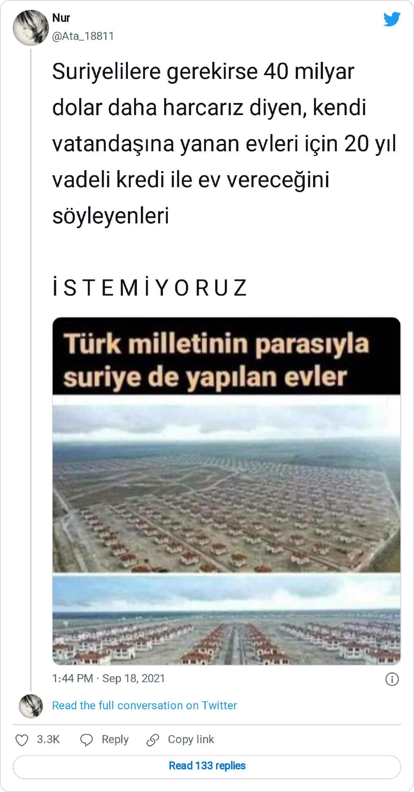 “Suriyelilere gerekirse 40 milyar dolar daha harcarız diyen, kendi vatandaşına yanan evleri için 20 yıl vadeli kredi ile ev vereceğini söyleyenleri İ S T E M İ Y O R U Z”