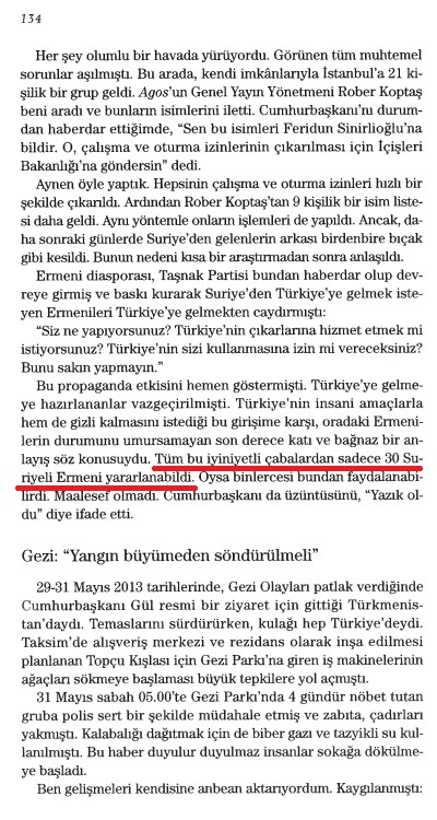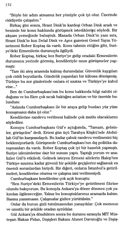 “Konuyu Cumhurbaşkanı Gül’e açtığımda, “Tamam, gelsinler, görüşelim” dedi. Ertesi gün üçü Tarabya Köşkü’nde Abdullah Gül’ün karşısındaydı. Bu kadar çabuk randevu verilmesini hiç beklemiyorlardı. Görüşmede Cumhurbaşkanı’nın dış politika danışmanları da vardı. Rober Koptaş çok iyi bir hazırlık yapmıştı. Suriye izlenimlerine dair bir sunum yaptı. Yaptığı yorum ve analizler Gül’ü etkiledi. Gelmek isteyen Ermeni ailelerin Halep’ten Türkiye sınırına kadar güvenli bir şekilde geçişlerim sağlamak en önemli sorunlardan biriydi. Bir diğeri, onların İstanbul’a getirilmeleri, kendilerine oturma ve çalışma izni verilmesiydi.