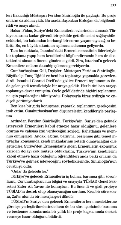 “Osman Kavala ile bir gün İstanbul’da Cezayir Restoran’da sohbet ederken, “Ahmet, biliyorsun Suriye’deki Ermeniler zor durumda. Türkiye onlara kapılarını açsa her yönden çok iyi bir adım atılmış olmaz mı?” diye bir fikir ortaya attı. Sayılan yaklaşık 50 bin civarında olan, daha çok Halep ve Şam’da yaşayan Ermenilerin çoğu zaten Türkiye kökenliydi.