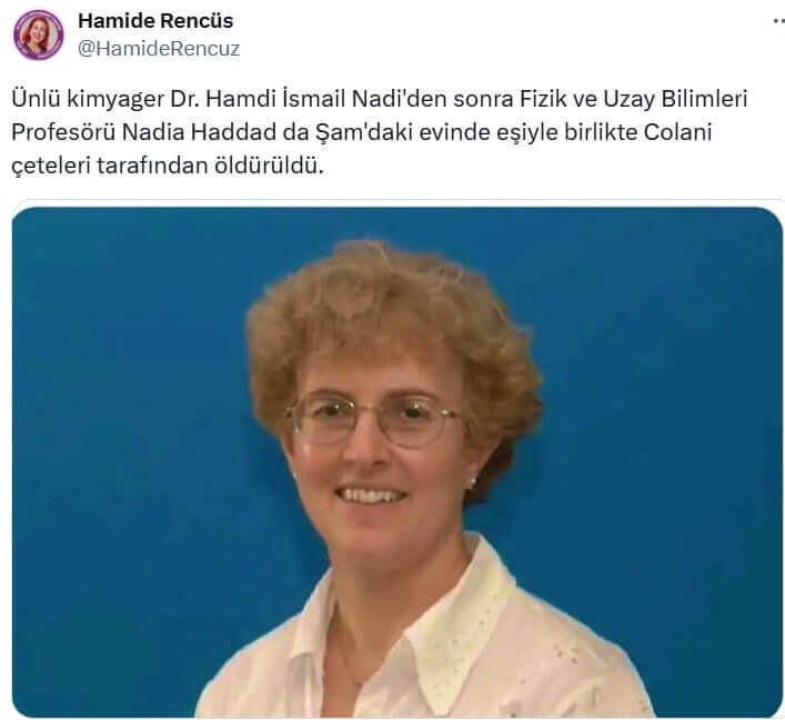 Hamide Rencüs (@HamideRencuz): “Ünlü kimyager Dr. Hamdi İsmail Nadi’den sonra Fizik ve Uzay Bilimleri Profesörü Nadia Haddad da Şam’daki evinde eşiyle birlikte Colani çeteleri tarafından öldürüldü.”
