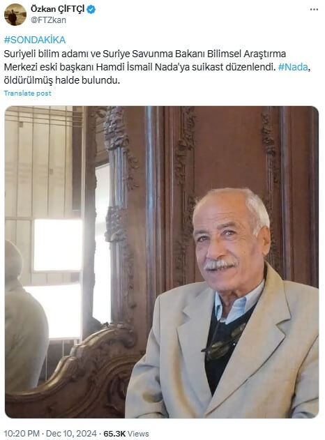 Özkan Çiftçi (@FTZkan): “#SONDAKİKA Suriyeli bilim adamı ve Suriye Savunma Bakanı Bilimsel Araştırma Merkezi eski başkanı Hamdi İsmail Nada’ya suikast düzenlendi. #Nada, öldürülmüş halde bulundu.”
