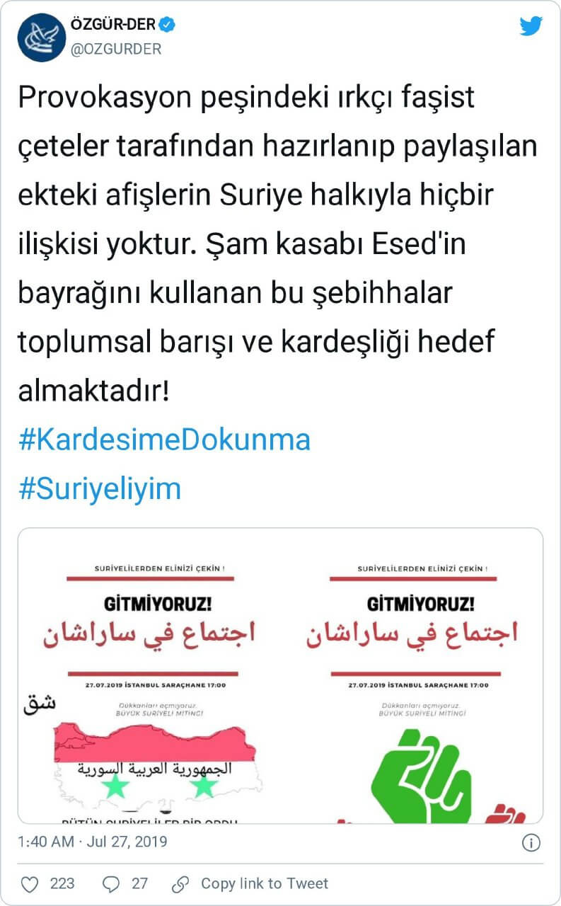 “Provokasyon peşindeki ırkçı faşist çeteler tarafından hazırlanıp paylaşılan ekteki afişlerin Suriye halkıyla hiçbir ilişkisi yoktur. Şam kasabı Esed’in bayrağını kullanan bu şebihhalar toplumsal barışı ve kardeşliği hedef almaktadır! #KardesimeDokunma #Suriyeliyim”