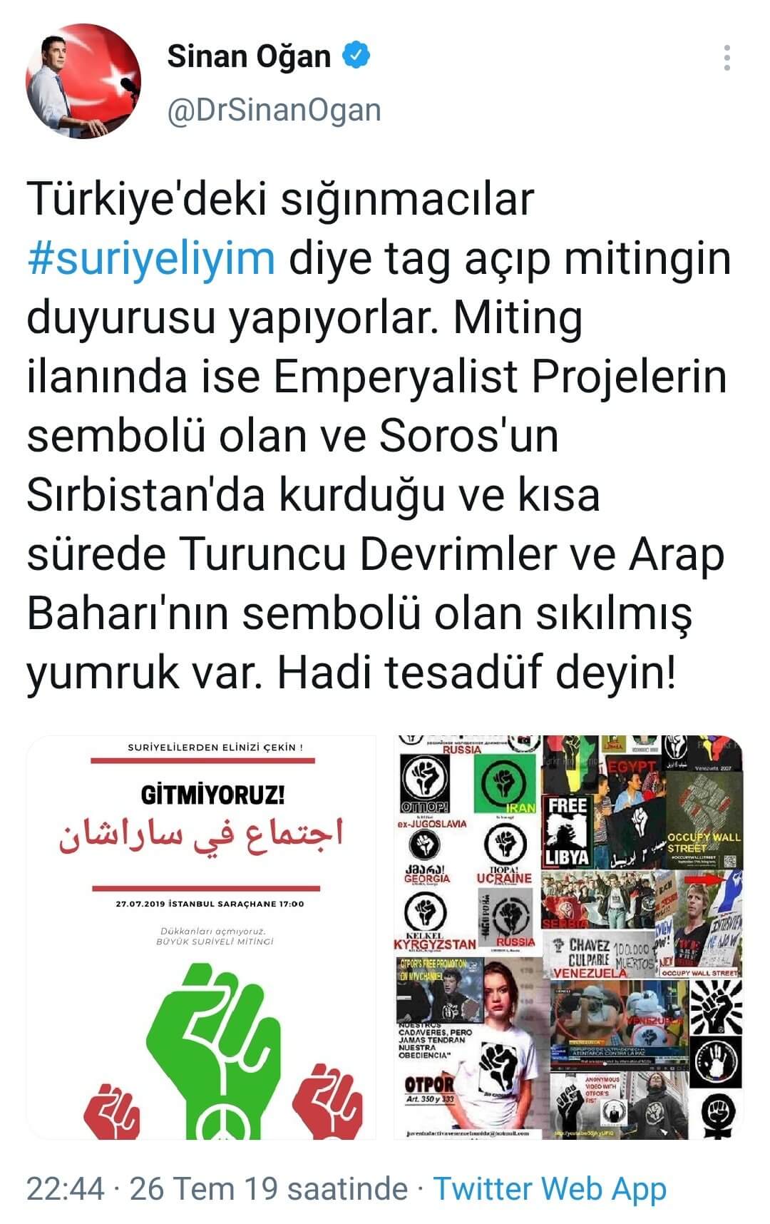 “Türkiye’deki sığınmacılar #suriyeliyim diye tag açıp mitingin duyurusu yapıyorlar. Miting ilanında ise Emperyalist Projelerin sembolü olan ve Soros’un Sırbistan’da kurduğu ve kısa sürede Turuncu Devrimler ve Arap Baharı’nın sembolü olan sıkılmış yumruk var. Hadi tesadüf deyin!”