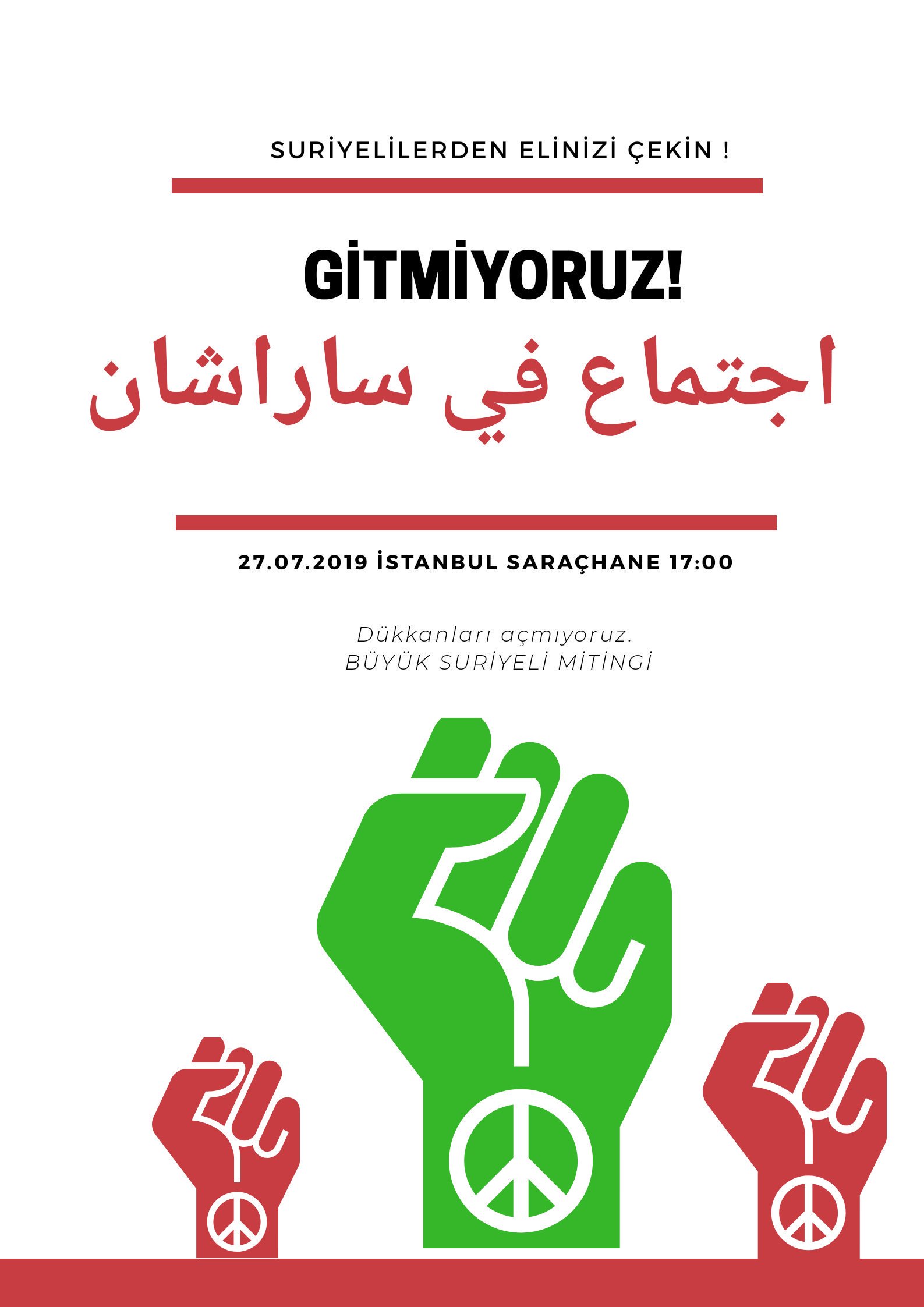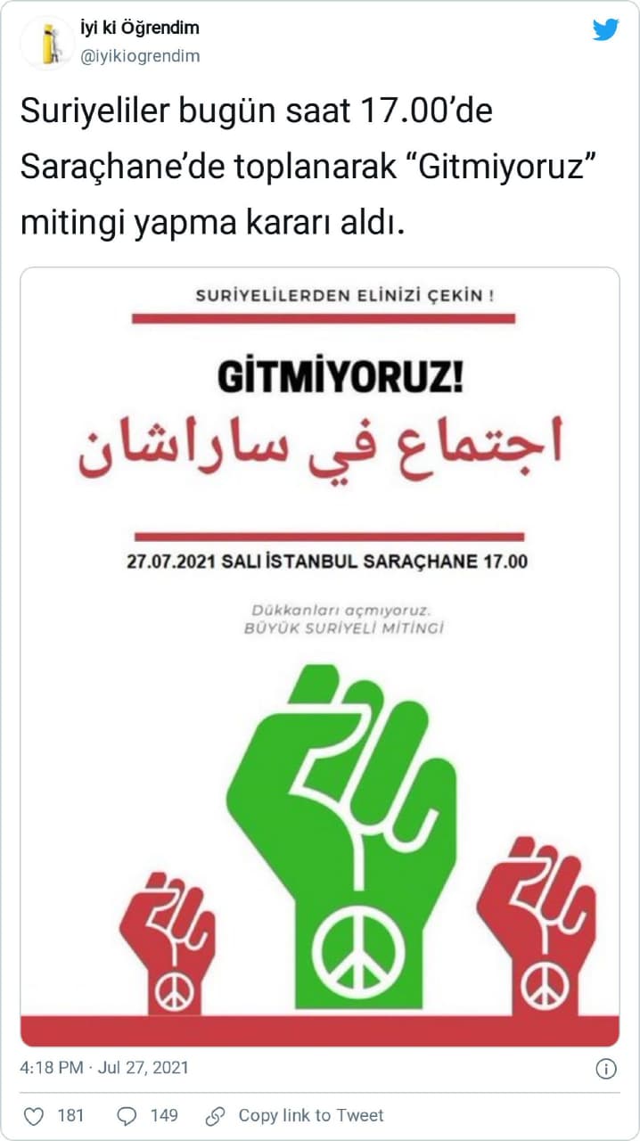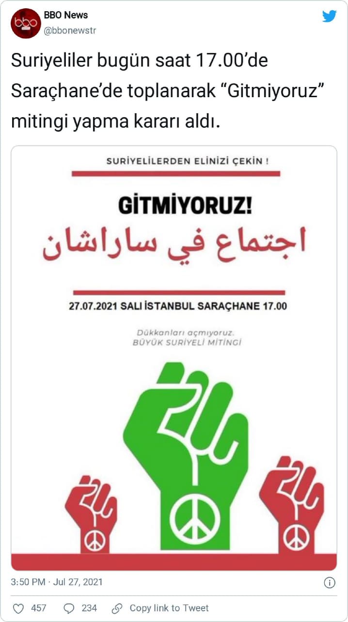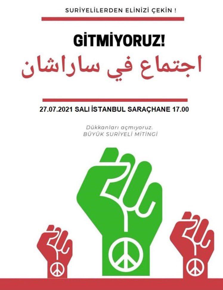 “Suriyeliler bugün saat 17.00’de Saraçhane’de toplanarak “Gitmiyoruz” mitingi yapma kararı aldı.”