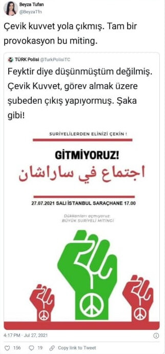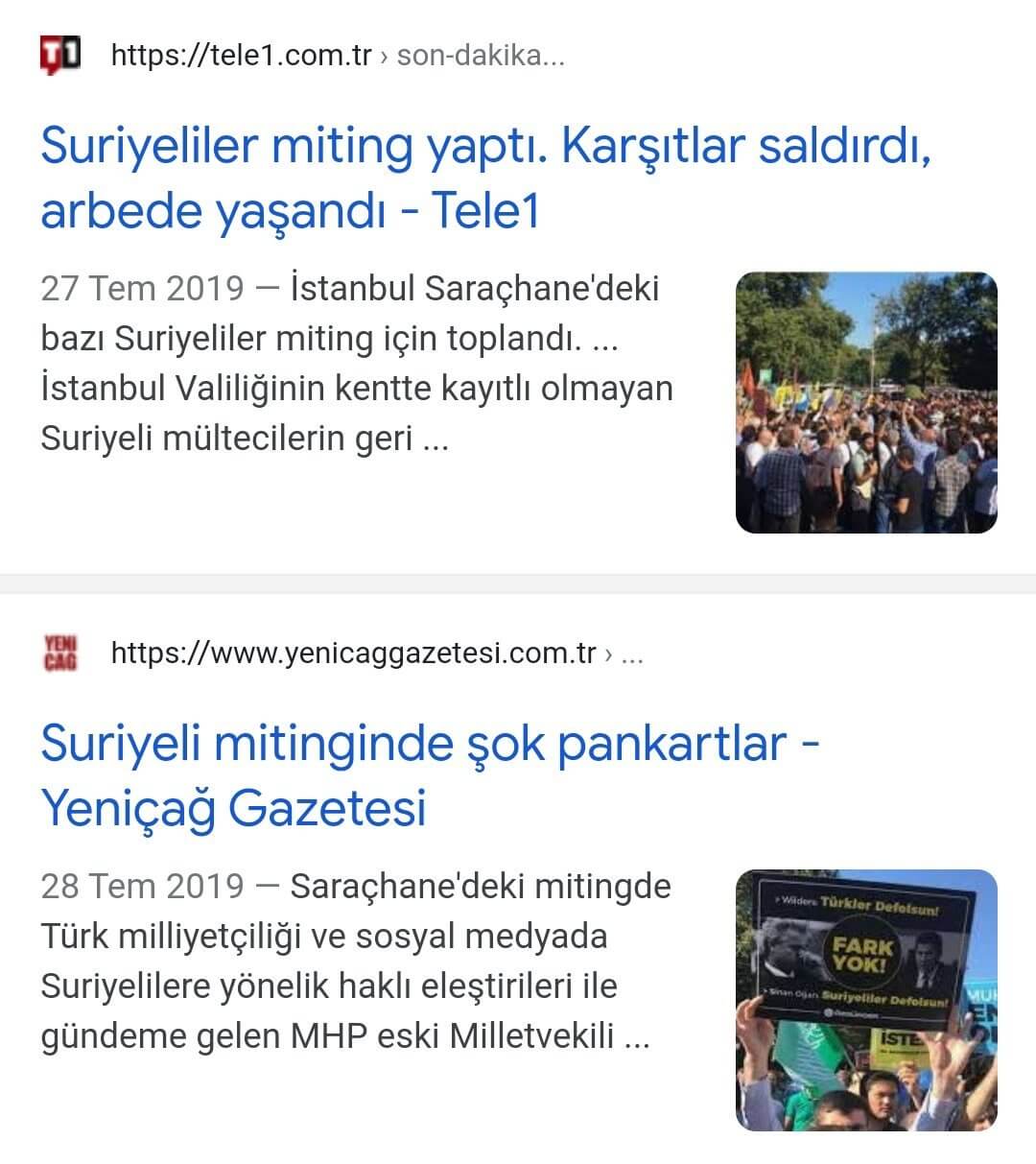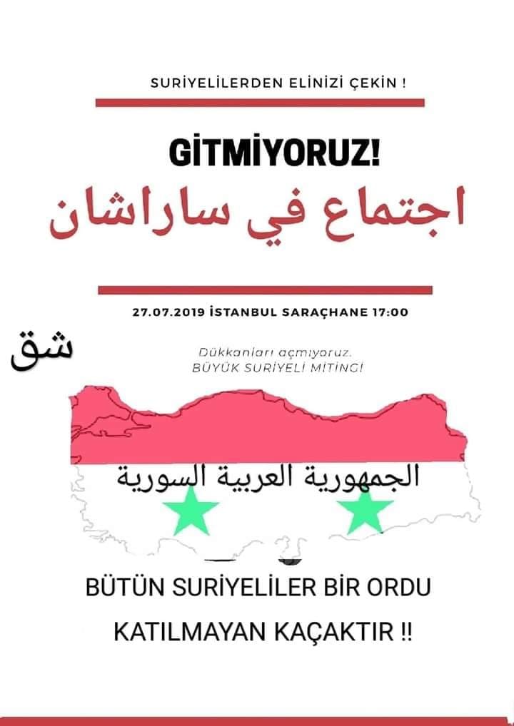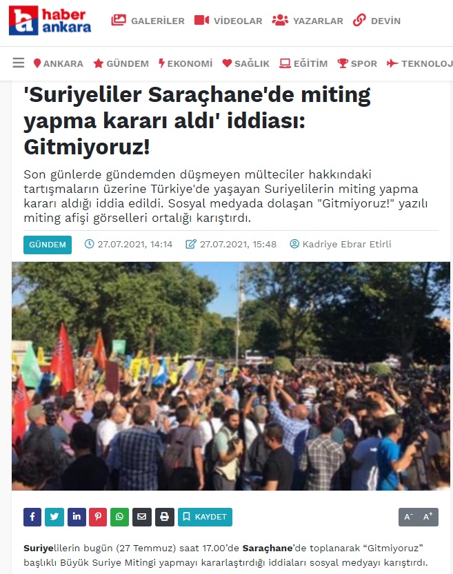 Suriyelilerin bugün (27 Temmuz) saat 17.00’de Saraçhane’de toplanarak “Gitmiyoruz” başlıklı Büyük Suriye Mitingi yapmayı kararlaştırdığı yönünde bir bilgi/bulguya rastlayamadık (İşbu yazının kaleme alındığı 17:17 itibarıyla Suriyeliler tarafından Saraçhane’de gerçekleştirilen bir miting tespit edilemiyor).