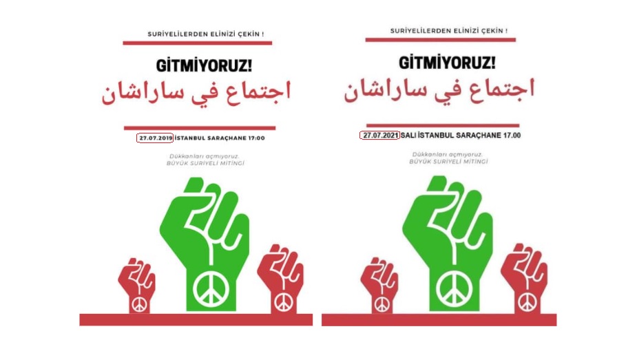 27 Temmuz 2021 tarihinde gerçekleşeceği öne sürülen Suriyeli mitingine ait olduğu iddiasıyla paylaşılan asılsız afişin, 2019 yılında dolaşıma sokulan afişin üzerinde tarih gibi kozmetik değişiklik gerçekleştirilen versiyonu olduğu anlaşılıyor.