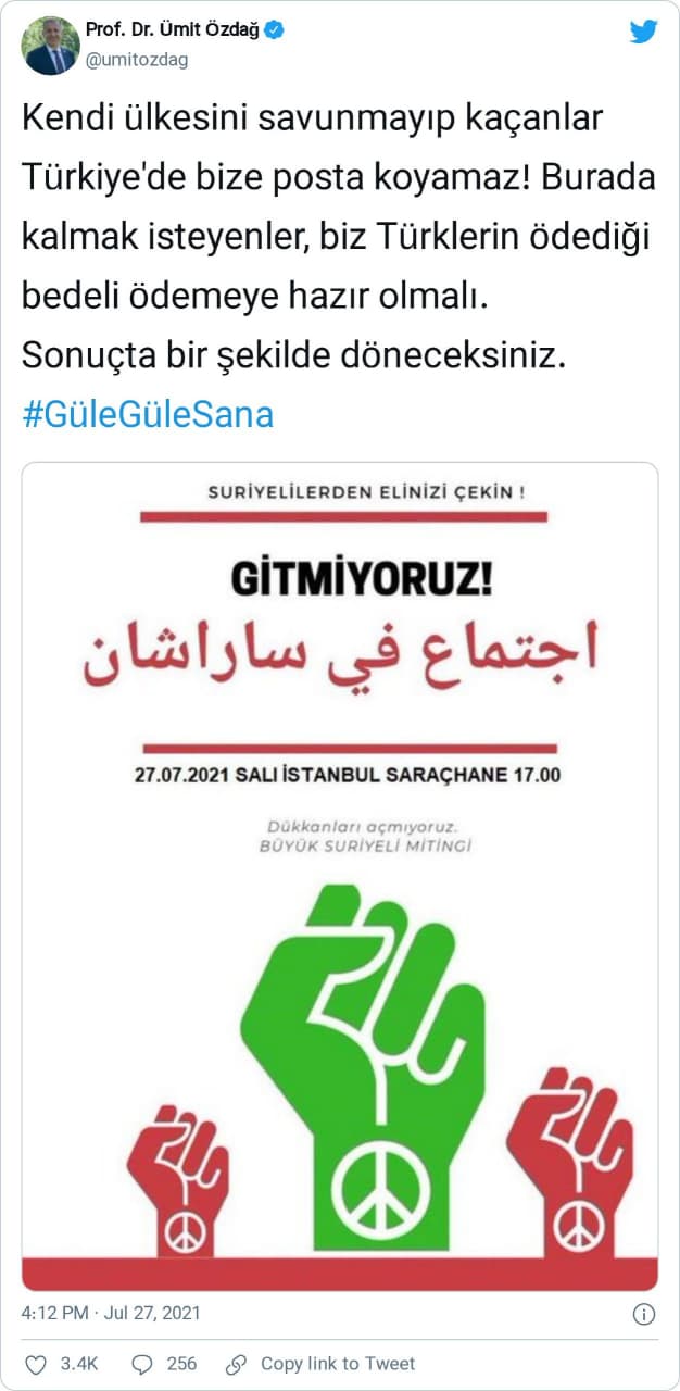 “Kendi ülkesini savunmayıp kaçanlar Türkiye’de bize posta koyamaz! Burada kalmak isteyenler, biz Türklerin ödediği bedeli ödemeye hazır olmalı. Sonuçta bir şekilde döneceksiniz. #GüleGüleSana”