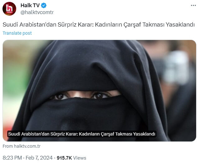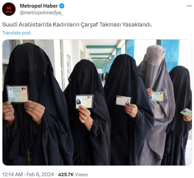 İLAVE: 2024 yılı Şubat ayında Suudi Arabistan’da kadınların çarşaf takmasının yasaklandığı iddiası yeniden dolaşıma girdi.