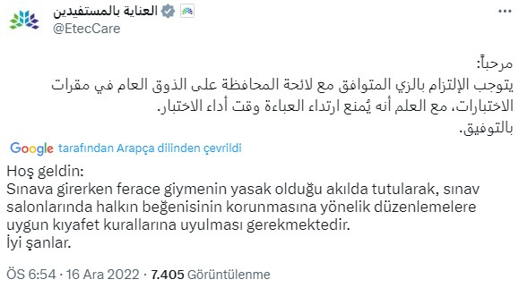 ETEC tarafından bir sosyal medya kullanıcısının sorusuna geçmişte verilen yanıtta “Sınava girerken ferace giymenin yasak olduğu akılda tutularak, sınav salonlarında halkın beğenisinin korunmasına yönelik düzenlemelere uygun kıyafet kurallarına uyulması gerekmektedir.” ifadeleri kullanılmış.
