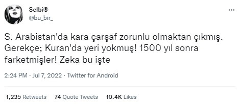 “S. Arabistan’da kara çarşaf zorunlu olmaktan çıkmış. Gerekçe; Kuran’da yeri yokmuş! 1500 yıl sonra farketmişler! Zeka bu işte”