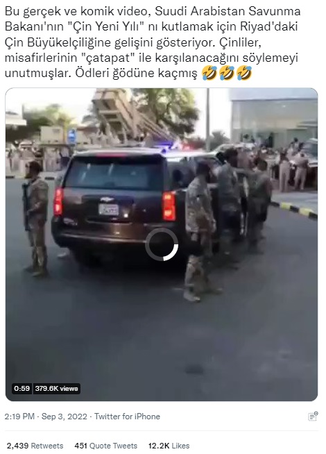 “Bu gerçek ve komik video, Suudi Arabistan Savunma Bakanı’nın “Çin Yeni Yılı” nı kutlamak için Riyad’daki Çin Büyükelçiliğine gelişini gösteriyor. Çinliler, misafirlerinin “çatapat” ile karşılanacağını söylemeyi unutmuşlar. Ödleri ğödüne kaçmış 🤣🤣🤣”