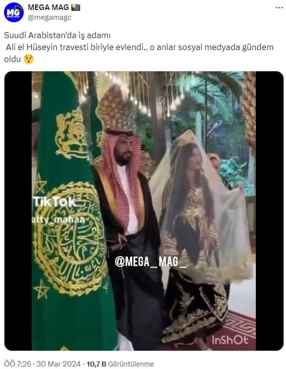 Suudi damadın bir travesti bireyle evlendiği yönündeki asılsız iddia “Mega Mac” adlı “megamagc” uzantılı Twitter / X profilinin 30 Mart 2024 tarihli paylaşımıyla yaygınlık kazandı.