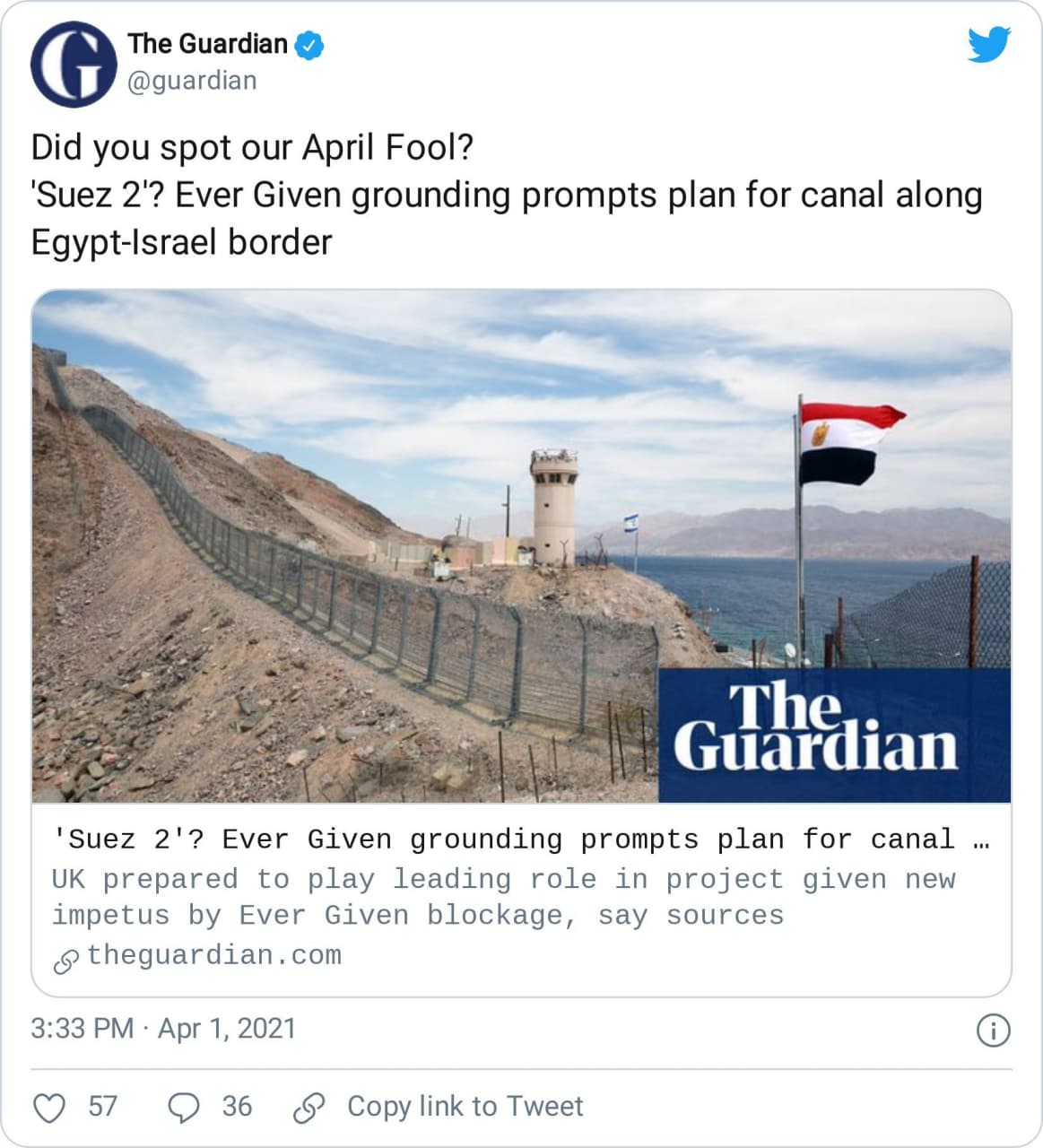 Guardian bu iddiaya 1 Nisan şakaları özel bölümünde 1 Nisan sabahı yayımladığı “‘Suez 2’? Ever Given grounding prompts plan for canal along Egypt-Israel border” başlıklı yazısında yer vermişti.
