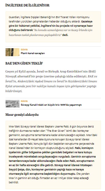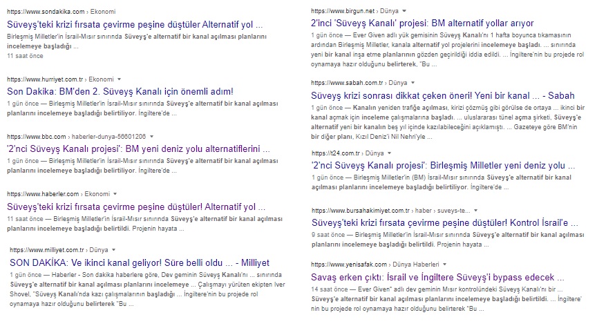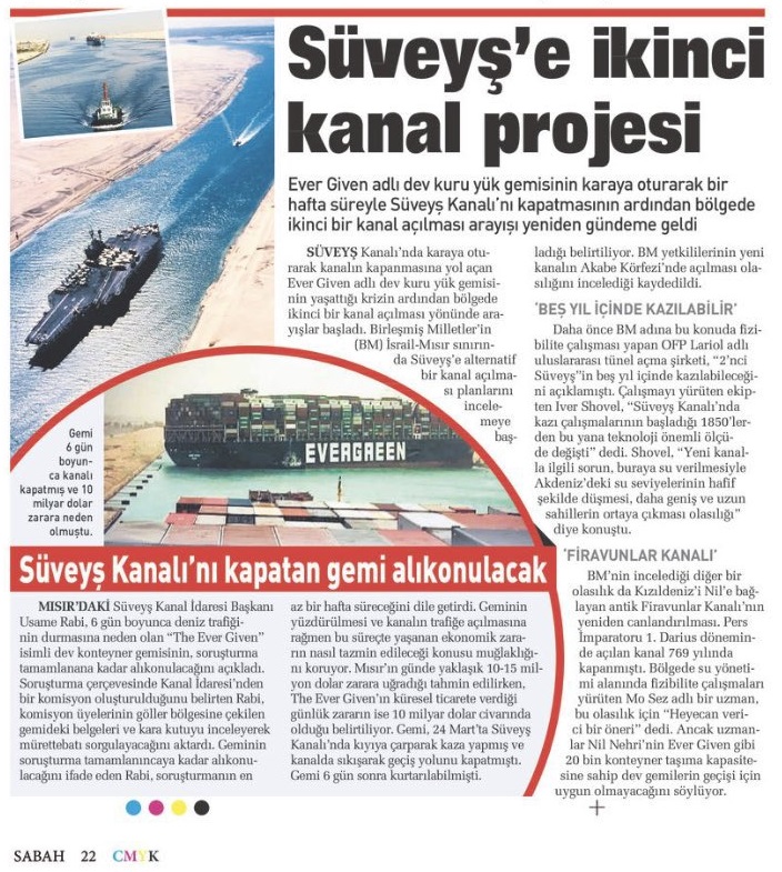 Sabah ise 2 Nisan 2021 tarihli gazetelerinin 22. sayfasında “Süveyş’e ikinci kanal projesi” başlığıyla vermişti.