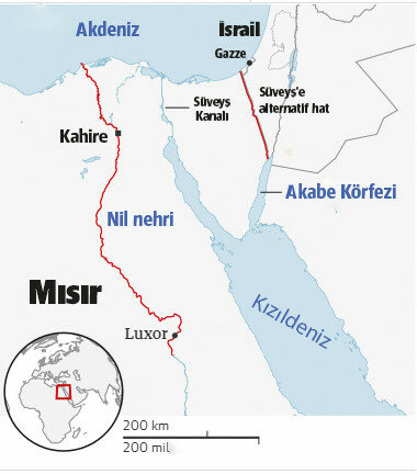 "Bunların başında Kanal’a bir alternatif yapılacağı iddiası var. İsrail’in Ashod ve Eliat kentleri arasında bir kanal yapılacağı ve bunun Süveyş’in yerini alacağı söyleniyor. Yerini tamamen alması mümkün değil. Zira kapasite ve coğrafya olarak bu imkânsız. Ama Süveyş’ten geçişleri azaltması ve dolayısı ile Mısır’ın gelirlerini düşürmesi muhtemel."