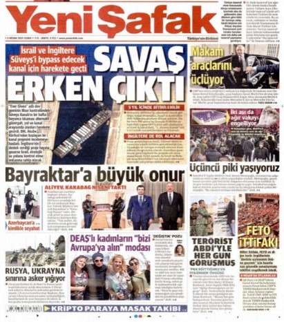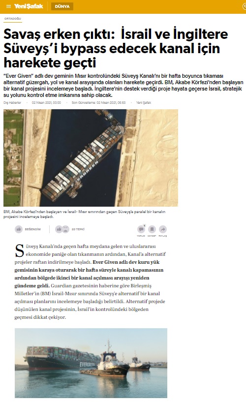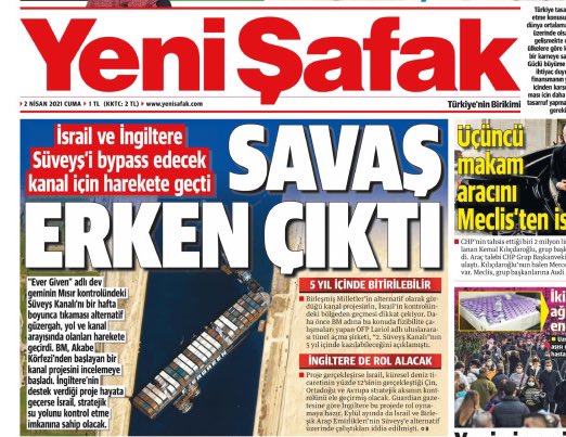 Yeni Şafak bu iddiaya 2 Nisan 2021 tarihli gazetelerinin ilk sayfasında “Savaş Erken Çıktı – İsrail ve İngiltere Süveyş’i bypass edecek kanal için harekete geçti” manşetiyle sunmuştu.