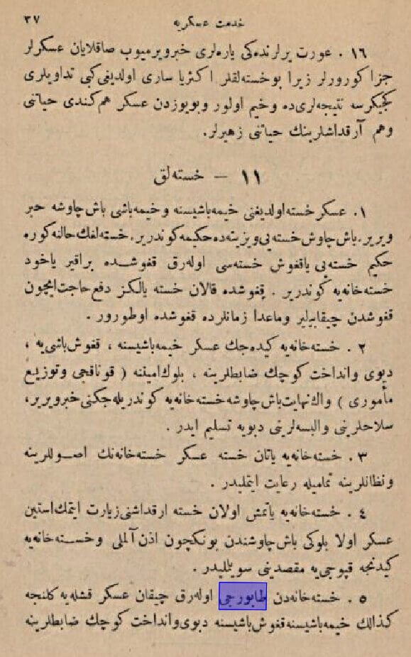 Yanlış kısmı ise, “taburcu” (“طابورجي”) kelimesinin Çanakkale Savaşı’ndan sonra dilimize yerleştiğidir.