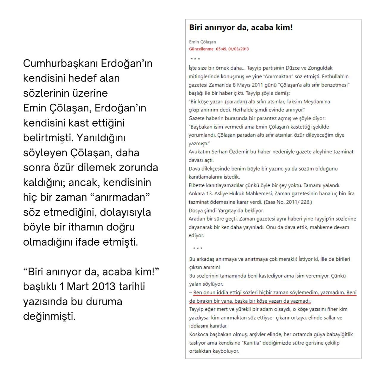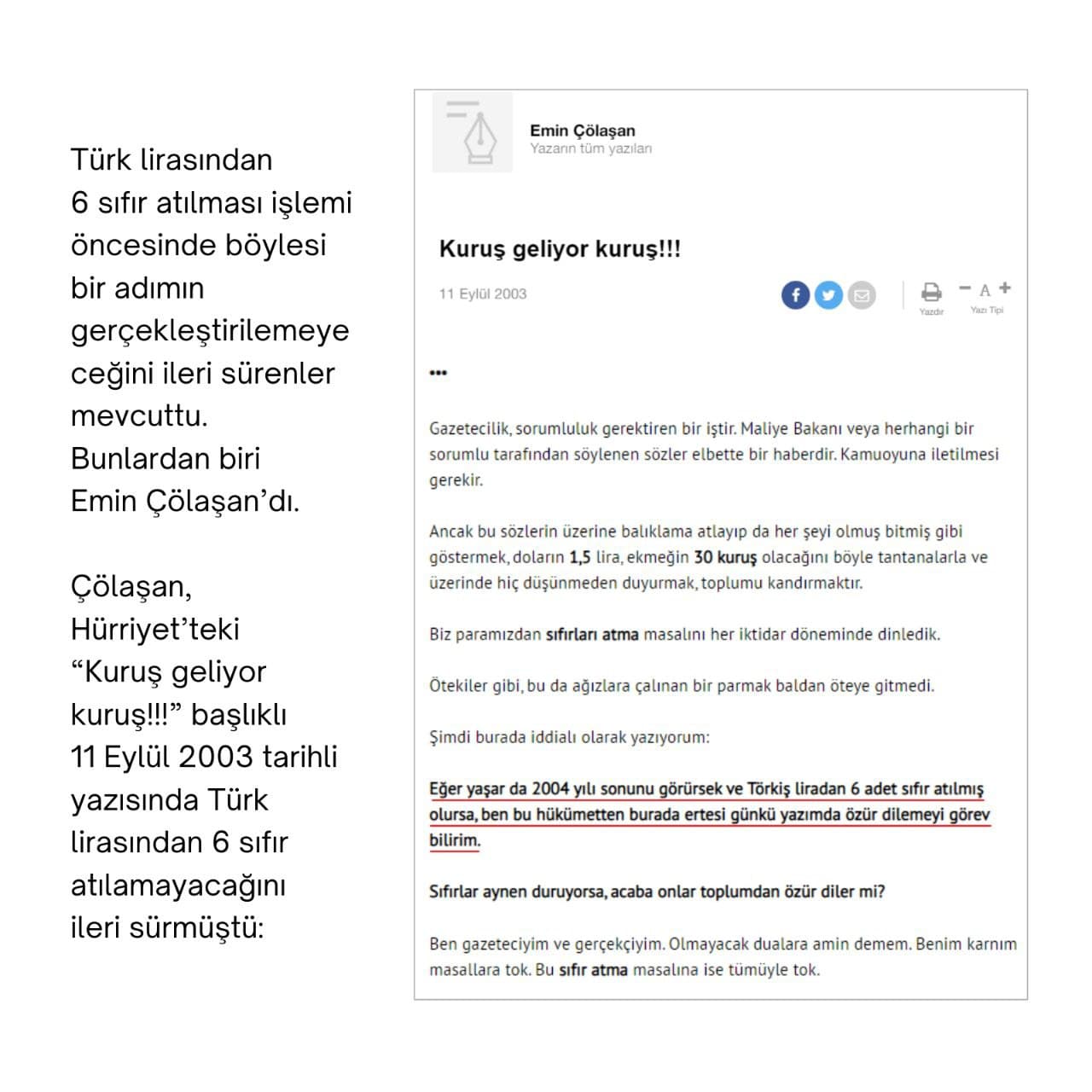 “Başbakan isim vermedi ama Emin Çölaşan’ı kastettiği şekilde yorumlandı. Çölaşan paradan altı sıfır atsınlar, özür dileyeceğim diye yazmıştı.”