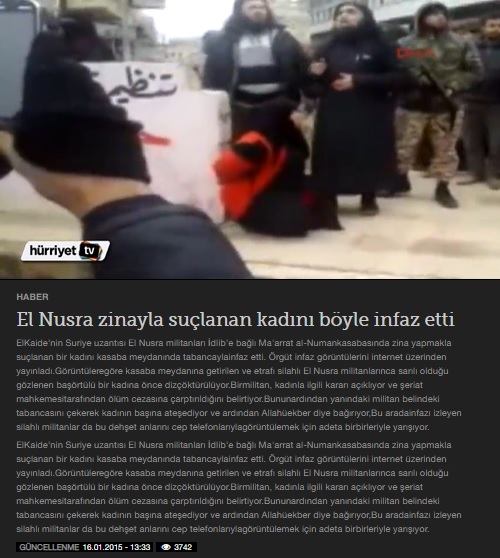 El Nusra militanlarının zina ile suçlanan kadını öldürdükleri bu görüntü ilgili dönemde büyük tepki çekmiş ve ülkemiz basın organlarınca da haberleştirilmişti.
