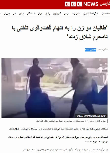 Bu görüntüyü BBC Farsça Servisi, Afganistan’ın kuzeyindeki Cevzcan vilayetinin Darzab ilçesine bağlı “Qaraei” adlı köyde kaydedildiği notuyla 29 Ekim 2018 tarihinde “Taliban, evli olmayan biriyle telefon görüşmesi yaptıkları suçlamasıyla iki kadını kırbaçladı.” başlığıyla aktarmış.
