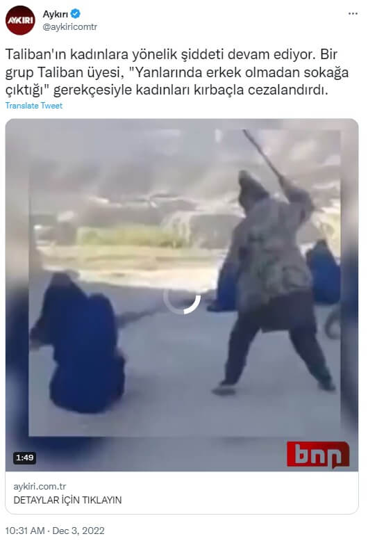 Aykırı: “Taliban’ın kadınlara yönelik şiddeti devam ediyor. Bir grup Taliban üyesi, “Yanlarında erkek olmadan sokağa çıktığı” gerekçesiyle kadınları kırbaçla cezalandırdı.”