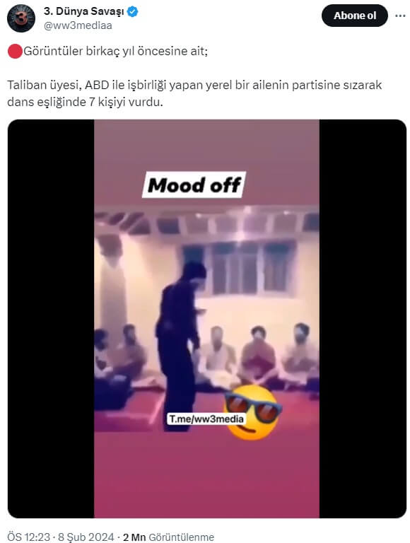 3. Dünya Savaşı (@ww3mediaa): “Görüntüler birkaç yıl öncesine ait; Taliban üyesi, ABD ile işbirliği yapan yerel bir ailenin partisine sızarak dans eşliğinde 7 kişiyi vurdu.”