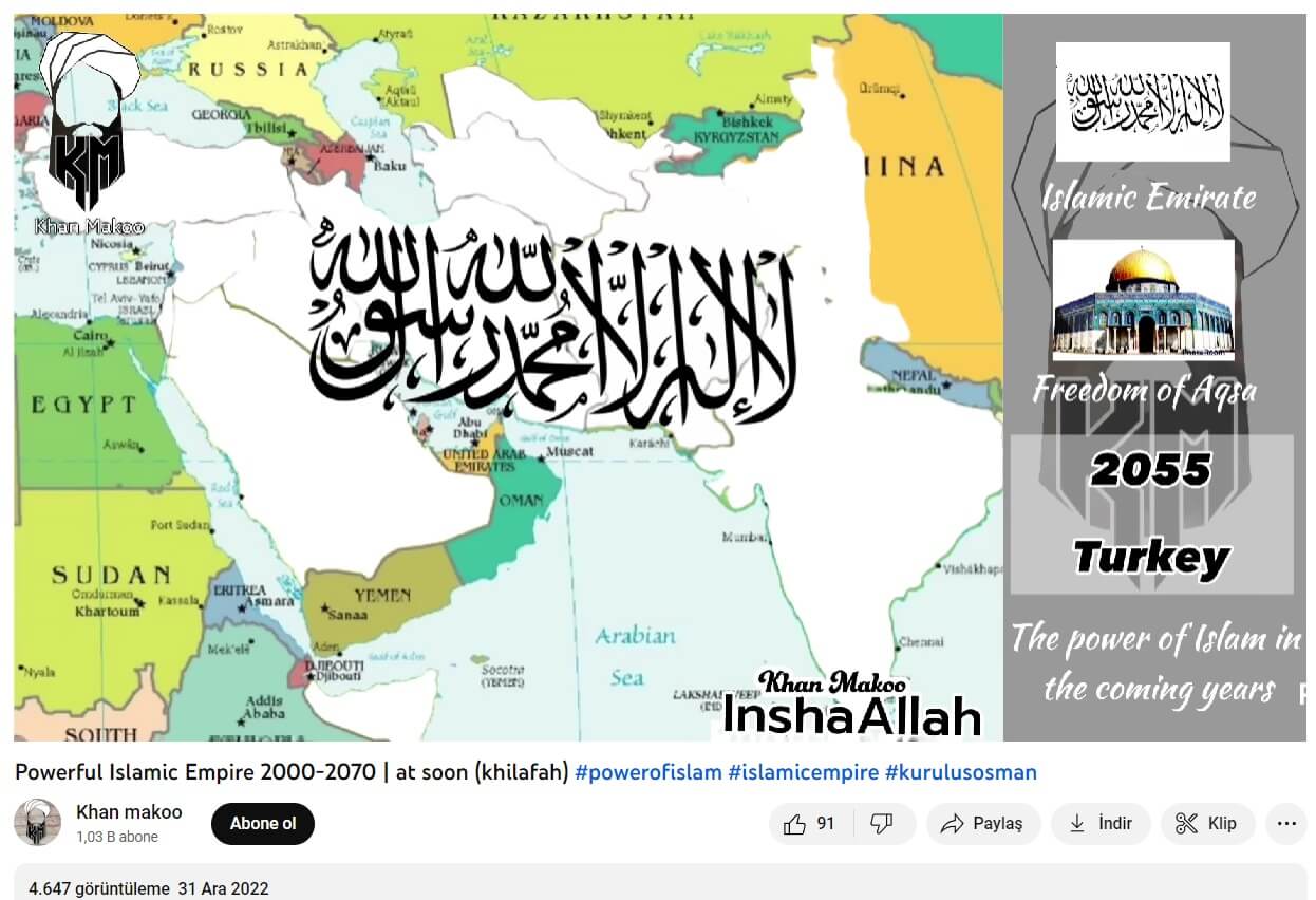 “Güçlü İslamî İmparatorluk 2000-2070 | yakında (halifelik) #islamıngücü #islamimparatorluğu #kuruluşosman” (“Powerful Islamic Empire 2000-2070 | at soon (khilafah) #powerofislam #islamicempire #kurulusosman“) başlığıyla 31 Aralık 2022 günü paylaşılan video şöyle:
