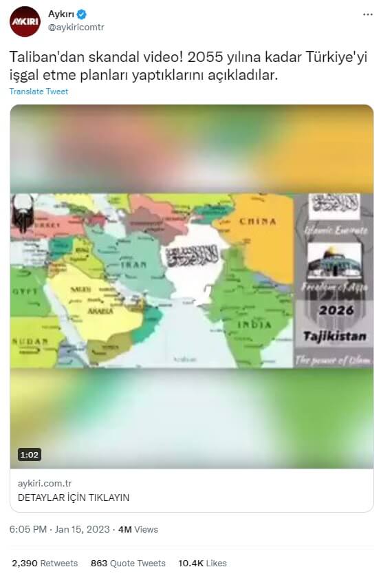 Çeşitli haber siteleri ve sosyal medya platformlarında haber paylaşımı yapan profiller tarafından “Taliban’dan skandal video! 2055 yılına kadar Türkiye’yi işgal etme planları yaptıklarını açıkladılar.” notuyla paylaşılan videoya değineceğiz.
