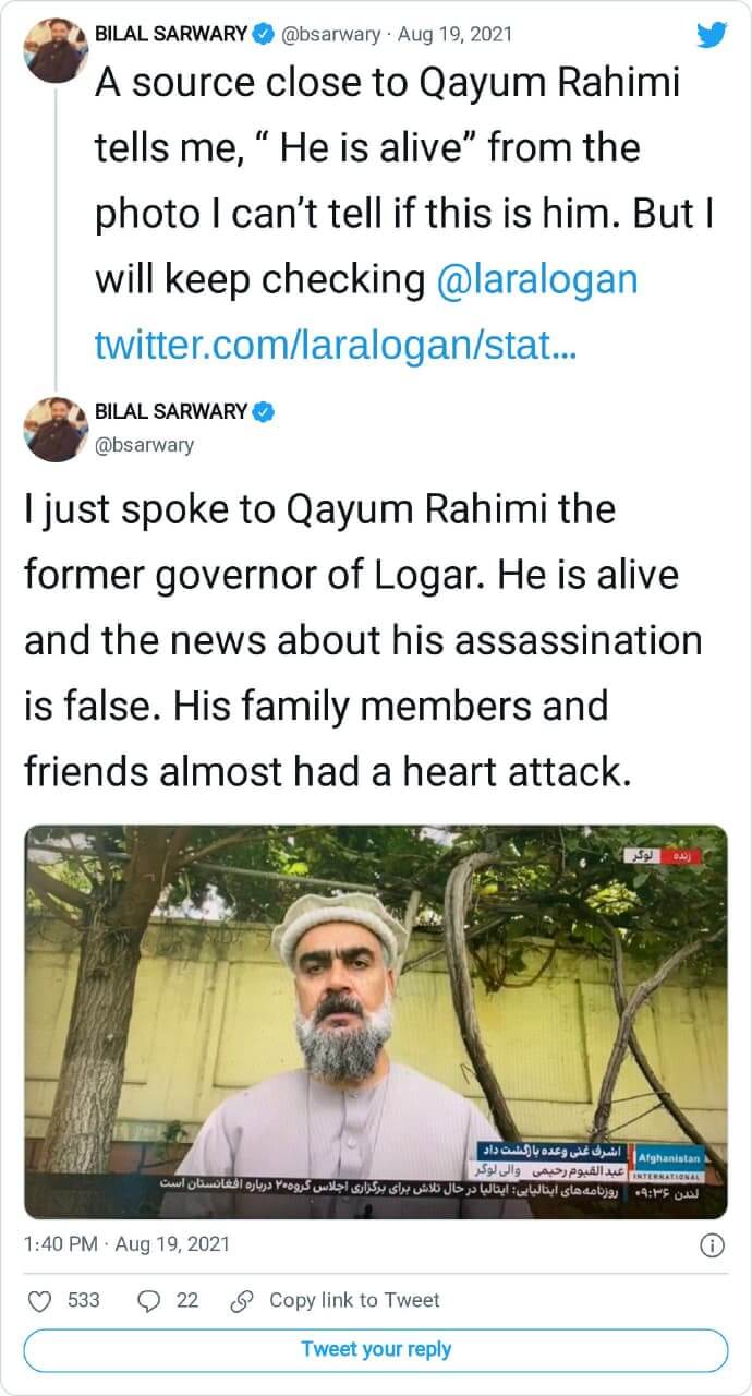 Afgan gazeteci Bilal Sarwary, Qayum Rahimi ile konuştuğunu teyit etti.