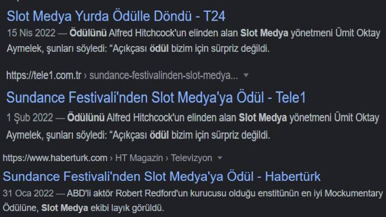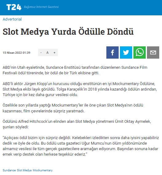 Ümit Oktay Aymelek ve Utku Şen işbirliğiyle hazırlanan kurgu metin ücreti mukabilinde Habertürk, T24 (advertorial başlığı altında), Tele1 gibi haber sitelerinde yayımlanmıştı (Habertürk’ün Magazin kategorisi altında https://www.haberturk.com/sundance-festivalinden-slot-medyaya-odul-3315326-magazin adresinde yayımladığı anlaşılan içeriğin arşiv bağlantısı alınamadı. Tele1’in “ilandır” notuyla, T24’ün “Advertorial” başlığı altında bu içeriği yayımladığı görüldü).