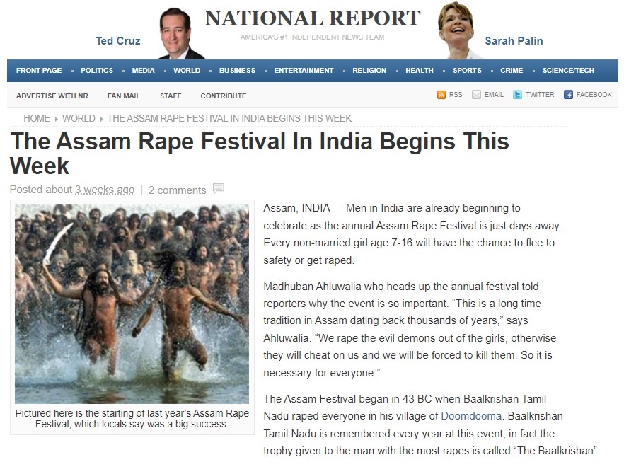 Metinde, baştan sona uydurma olduğunu işaret eden “Hindistan’daki erkekler, her yıl düzenlenen Assam Tecavüz Festivali’ne sadece birkaç gün kaldığı için şimdiden kutlamaya başlıyor. 7-16 yaşlarındaki evli olmayan her kadın, güvenli bir yere kaçma veya tecavüze uğrama şansına sahip olacak” gibi birçok absürt ifadeye yer verilmişti.