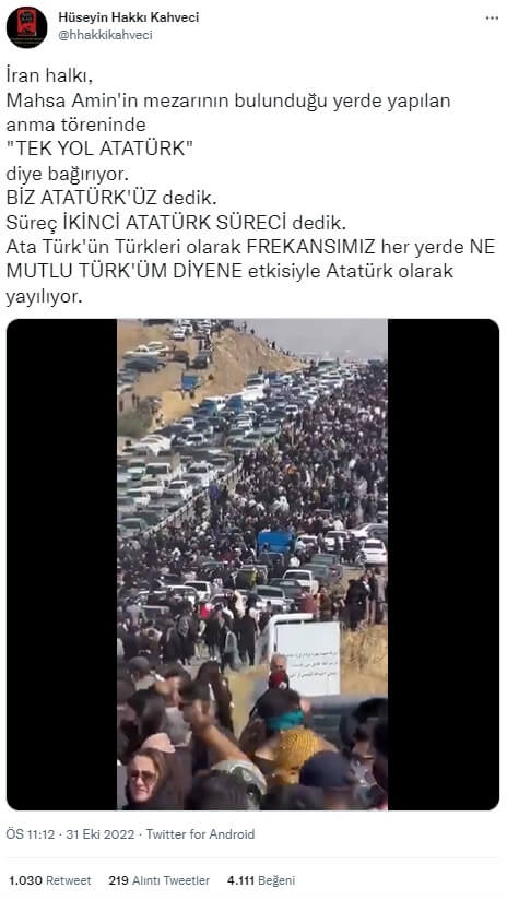 “İran halkı, Mahsa Amin’in mezarının bulunduğu yerde yapılan anma töreninde “TEK YOL ATATÜRK” diye bağırıyor. BİZ ATATÜRK’ÜZ dedik. Süreç İKİNCİ ATATÜRK SÜRECİ dedik. Ata Türk’ün Türkleri olarak FREKANSIMIZ her yerde NE MUTLU TÜRK’ÜM DİYENE etkisiyle Atatürk olarak yayılıyor.”