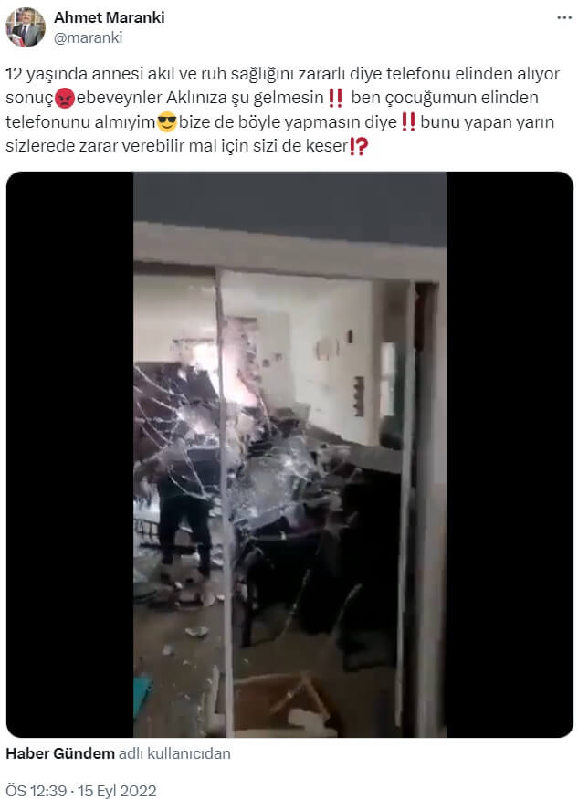 Ahmet Maranki (@maranki): “12 yaşında annesi akıl ve ruh sağlığını zararlı diye telefonu elinden alıyor sonuçebeveynler Aklınıza şu gelmesin‼️ ben çocuğumun elinden telefonunu almıyimbize de böyle yapmasın diye‼️bunu yapan yarın sizlerede zarar verebilir mal için sizi de keser⁉️”