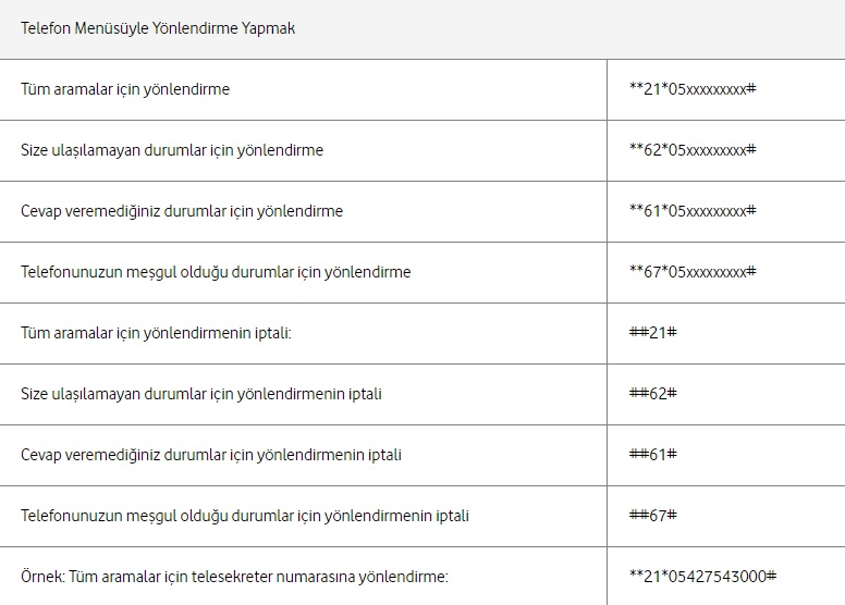 • Meşgul Olma Durumunda Çağrı Yönlendirme: **67*TELEFON NO# yazılıp arama tuşuna basılarak yönlendirme gerçekleştirilebilir. Örnek: **67*0 555 XXX XX XX#