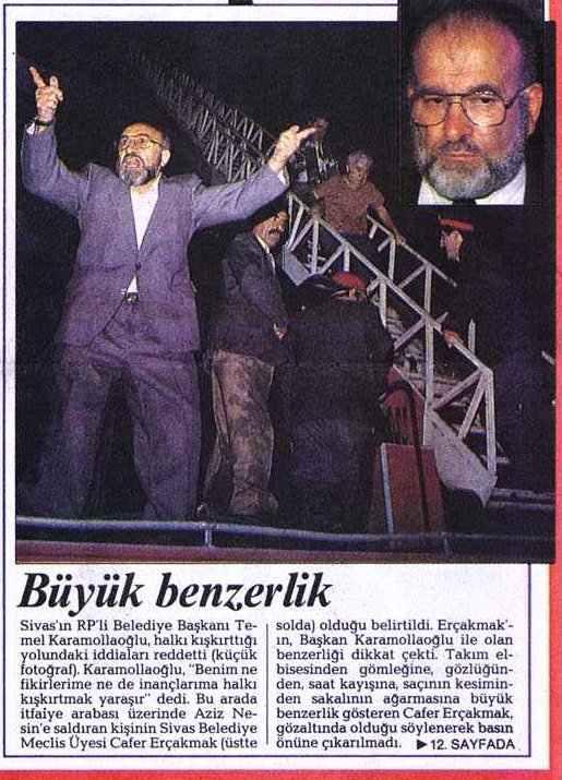 Sivas Belediye Başkanı RP’li Temel Karamollaoğlu, faciayla sonuçlanan olaylar sırasında tahrikçilik yapan sakallı kişiye şaşırtıcı derecede benziyor.”