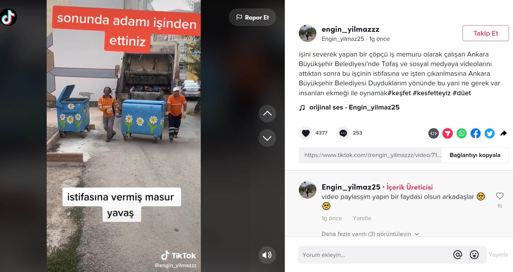 “işini severek yapan bir çöpçü iş memuru olarak çalışan Ankara Büyükşehir Belediyesi’nde Tofaş ve sosyal medyaya videolarını attıktan sonra bu işçinin istifasına ve işten çıkarılmasına Ankara Büyükşehir Belediyesi Duyduklarım yönünde bu yani ne gerek var insanları ekmeği ile oynamak #keşfet #kesfetteyiz #düet”